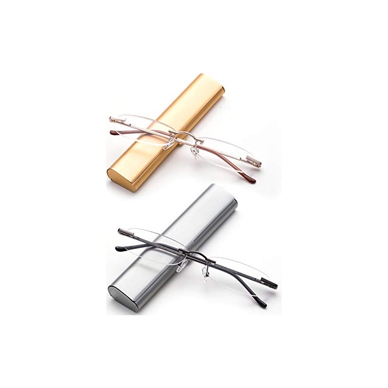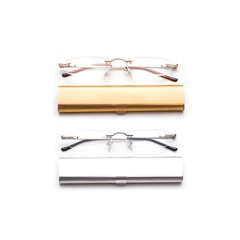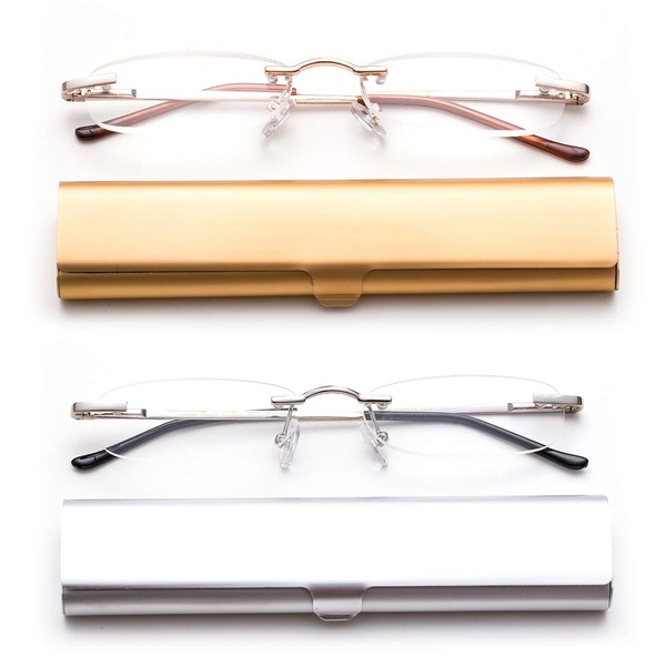2 Pack Compact Reading Glasses in Tube Slim Rimless Reader in Aluminum Case