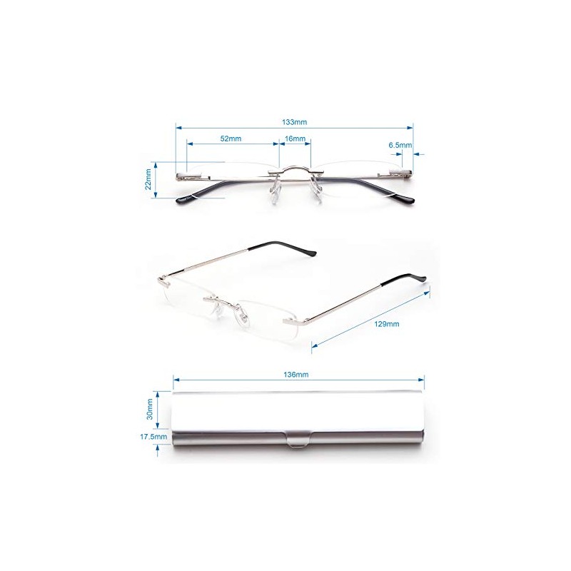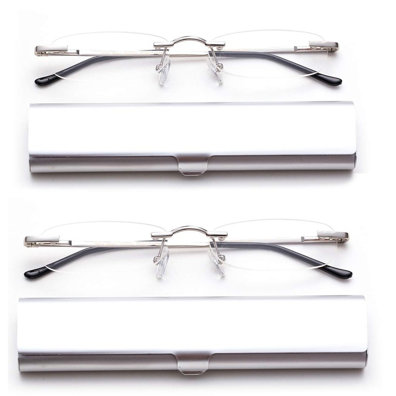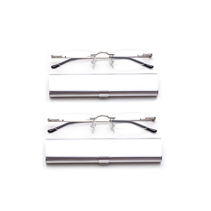 2 Pack Compact Reading Glasses in Tube Slim Rimless Reader in Aluminum Case
