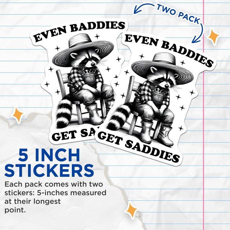 (2 Pack) Even Baddies Get Saddies Stickers - Cute Raccoon Stickers - Fun Animal Stickers - 5" On Longest Side - Sticks to Smooth Flat Surfaces - Made in USA - BMCS3738