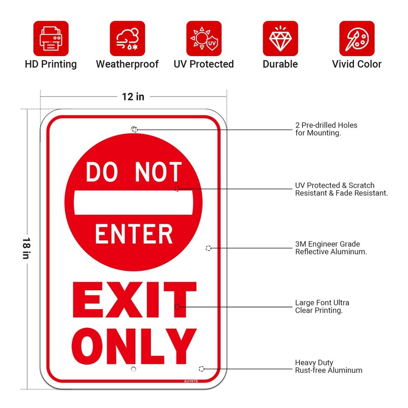 - Easy To Install: The Exit Only Sign measures 18" x 12", It comes with 2 pre-drilled mounting holes, easy to install.