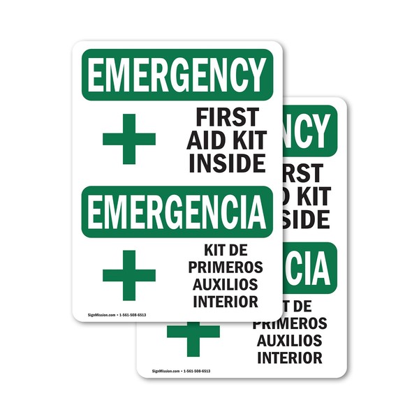 (2 Pack) First Aid Kit Inside Bilingual OSHA Emergency Sign 10 Inch X 14 Inch Vinyl Label Decal Sticker Weather Resistant, UV Protected for Workplace, Business, and Construction Site, Made in the USA