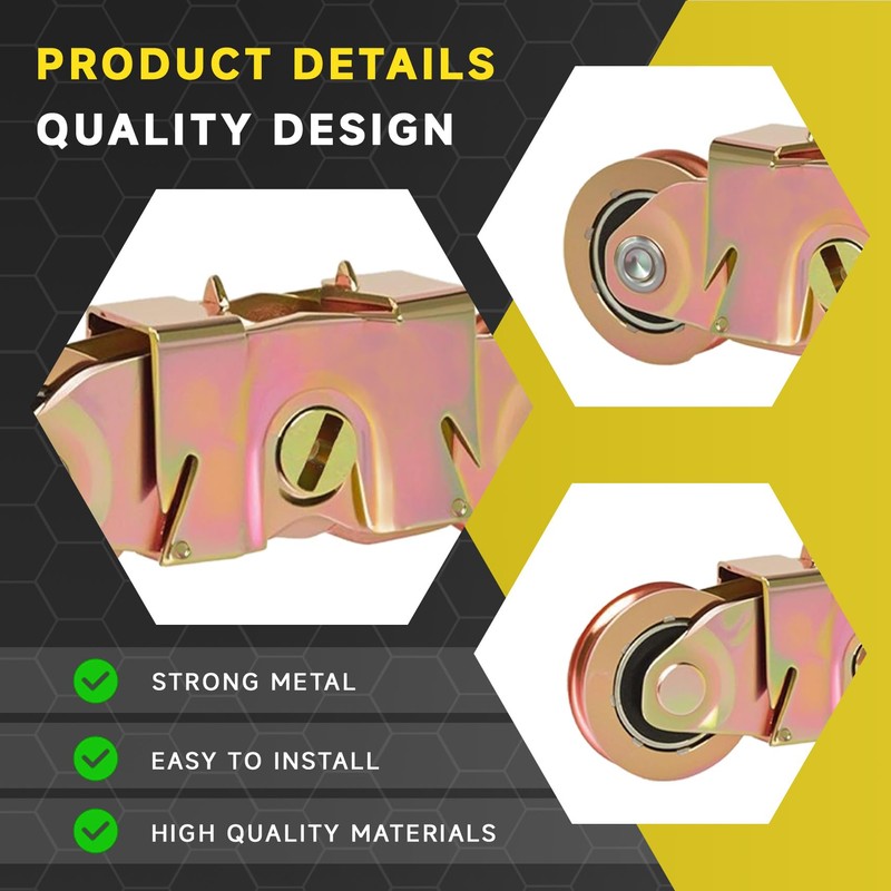 - Sturdy Construction: 1-1/4 inch diameter tandem concave steel wheels, Stamped steel housing with ball bearing rollers, provide smooth gliding operation with self-contained leveling adjuster