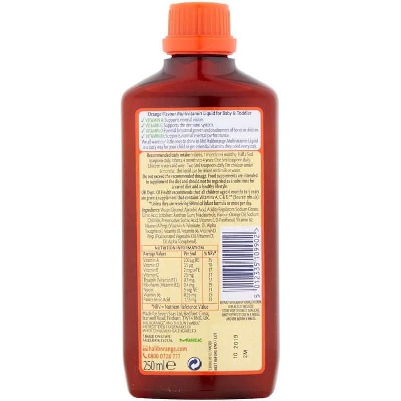Helps maintain healthy immune defences and healthy bones and teeth Delicious orange flavour Contains 9 essential vitamins Designed in line with scientific research on children's reference nutrient intakes and ideal for every stage of your child's development, Haliborange baby and toddler multivitamin liquid contains a balanced range of 9 essential vitamins to help maintain healthy immune defences, mental performance and healthy bones and teeth. While we try to ensure that product information is correct, on occasion manufacturers may alter their ingredient lists.  Please note actual image may vary. Information on this site is not intended to diagnose or treat any health condition. We recommend that if you are pregnant, nursing, have a medical condition or are currently taking medication that you seek advice from a health professional before you take any dietary supplement. Always read the product directions before use and do not exceed the recommended intake. Food Supplements should not be taken as an alternative to a balanced diet. Keep out of reach of children.