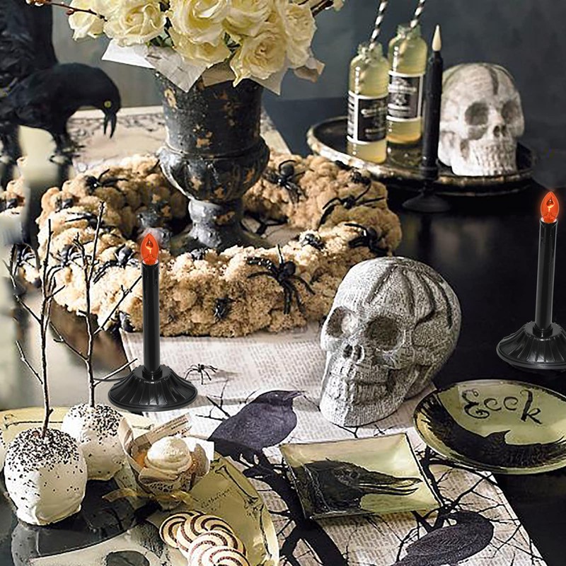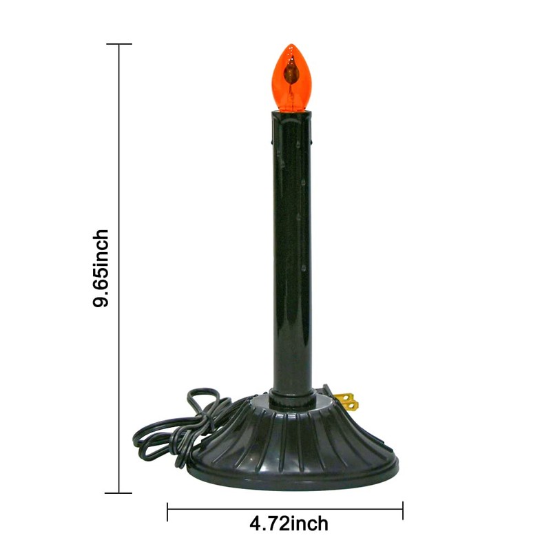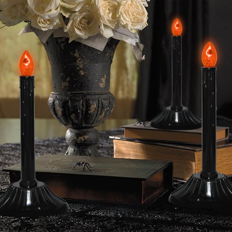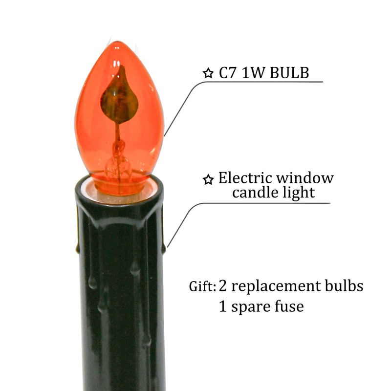 - 🥇Halloween Candles: 2 Pack Black electric candle lamp with 4 C7 orange flcker flame light bulbs (2 spare), 1 Watt/ bulbs, halloween electric candoliers for Halloween Window, party, home decorations and lighting
