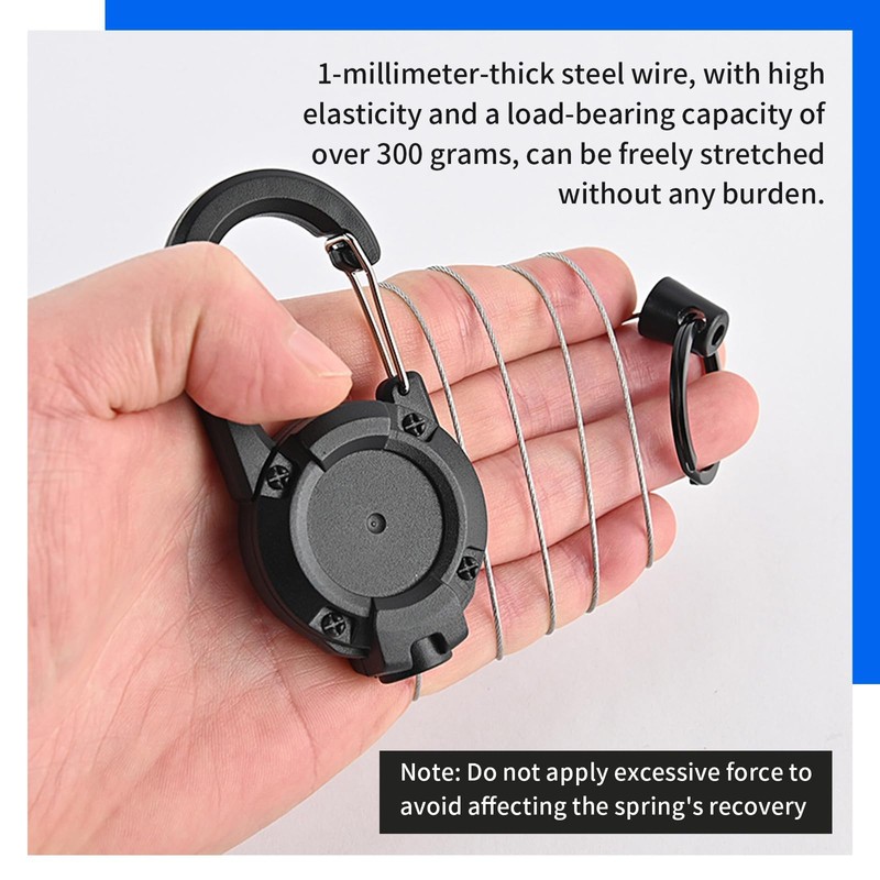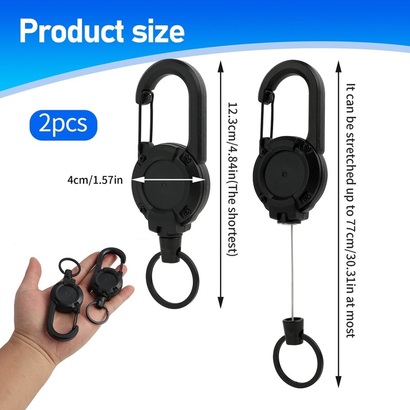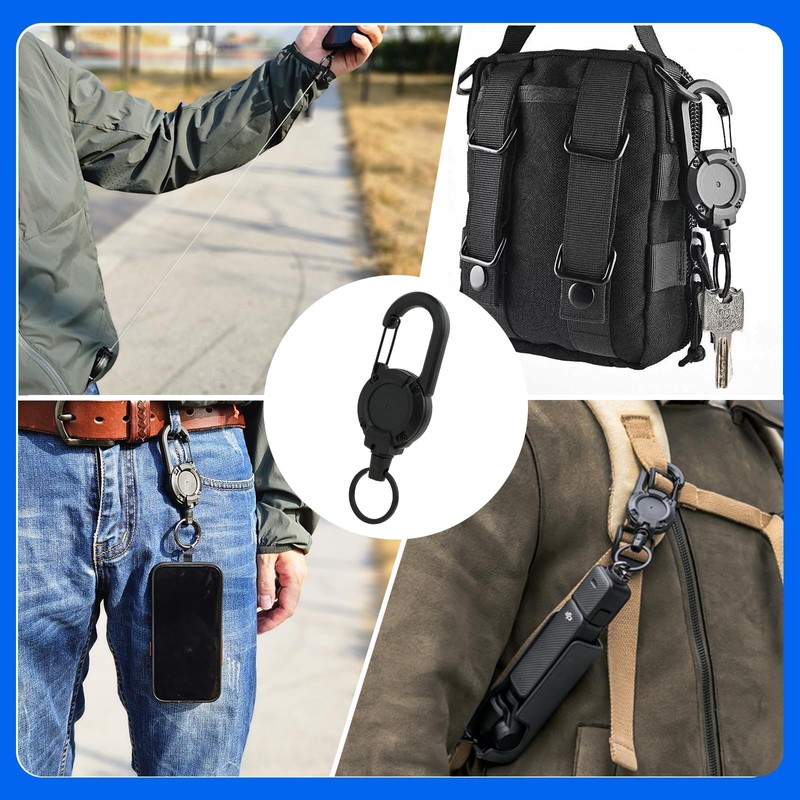 - VERSATILE CARABINER CLIP The lanyard extender equipped with a enduring carabiner clip, these badge reels can securely attach to belts, bags, or lanyards, providing easy access to your essentials while keeping them safe and within reach.