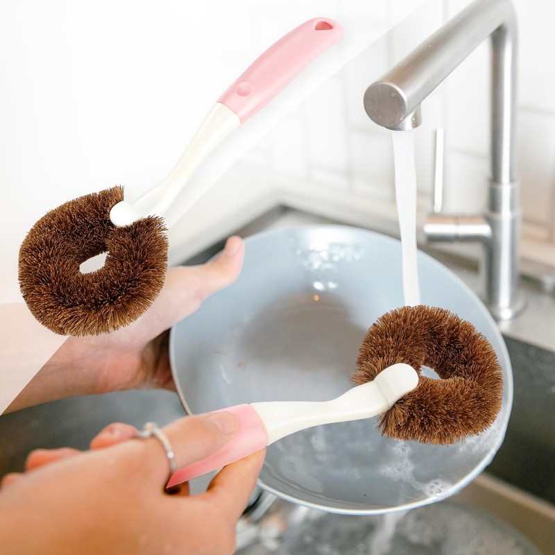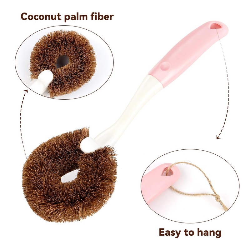 Long handle of dishwashing brush is made of plastic and coconut fiber, smooth to hold. Non-scratch and odorless bristles are reliable