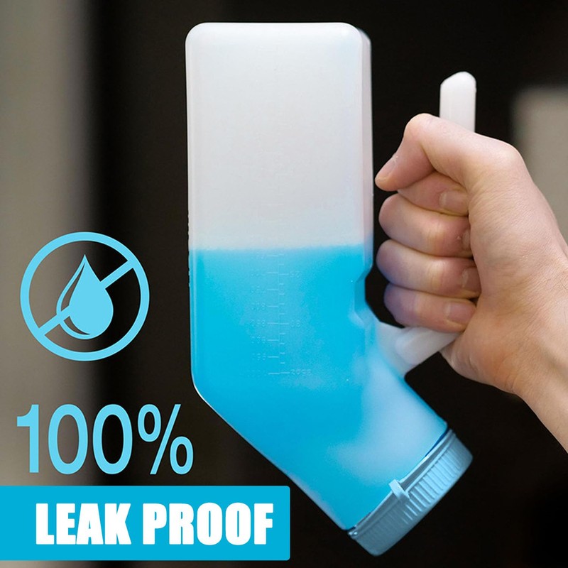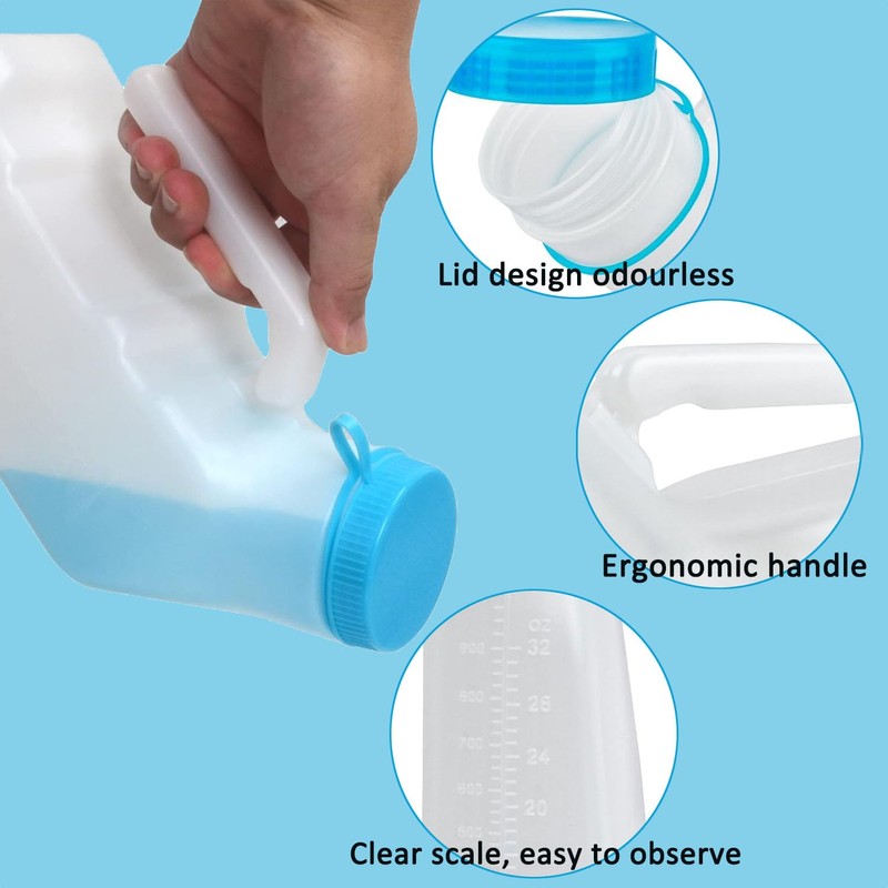 • 2 Pack Male Urinal Bottle with Glow in The Dark Lid,32oz/1000mL Plastic Mens Bedpan Bottle with Spill Proof Screw Cap for Travel & Urine Collection, Measuring Scale | Easy Grip Handle (Blue)