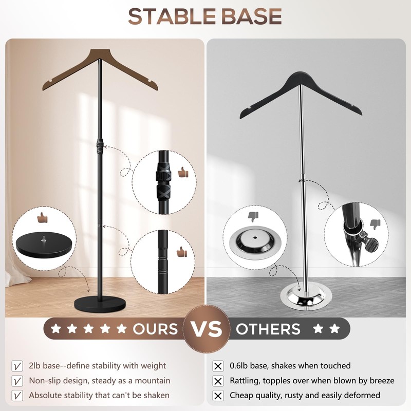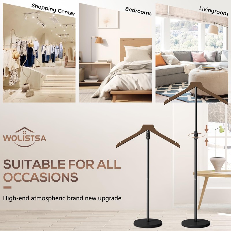 - [Quality Materials] This garment rack combines high-quality metal and wood for a durable, professional look. The 7-inch metal base weighs 2 pounds, providing outstanding stability. The wooden hanger is crafted from high-quality wood, offering ample space to showcase your shirts, coats, and other apparel