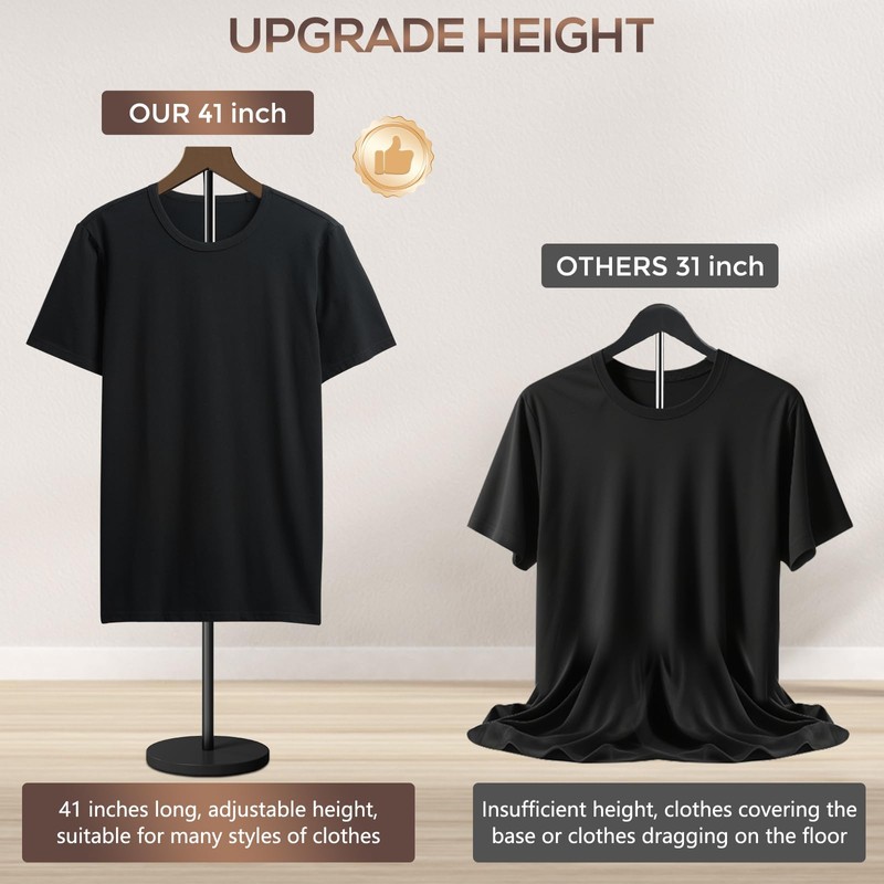 - [Ensure Stable Use] For best use, adjust shirt display stand between 30 to 41 inches. Exceeding 41" may cause connector to not fit tightly and cause wobbling. Staying within this range ensures secure stability and extends product life