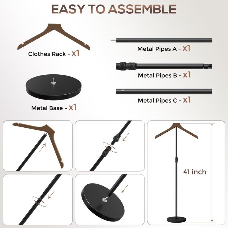 - [Modular Design Effortless Adjustment] This shirt display stand features three metal tubes. Tubes B and C form a sturdy main structure through threaded rotation, while Tube A is an adjustable telescopic rod that can be extended from 30 to 41 inches. Designed to showcase diverse clothing items, this stand is superior to shorter garment racks. With one-touch operation, you can customise the optimal display height for T-shirts, long coats and other garments