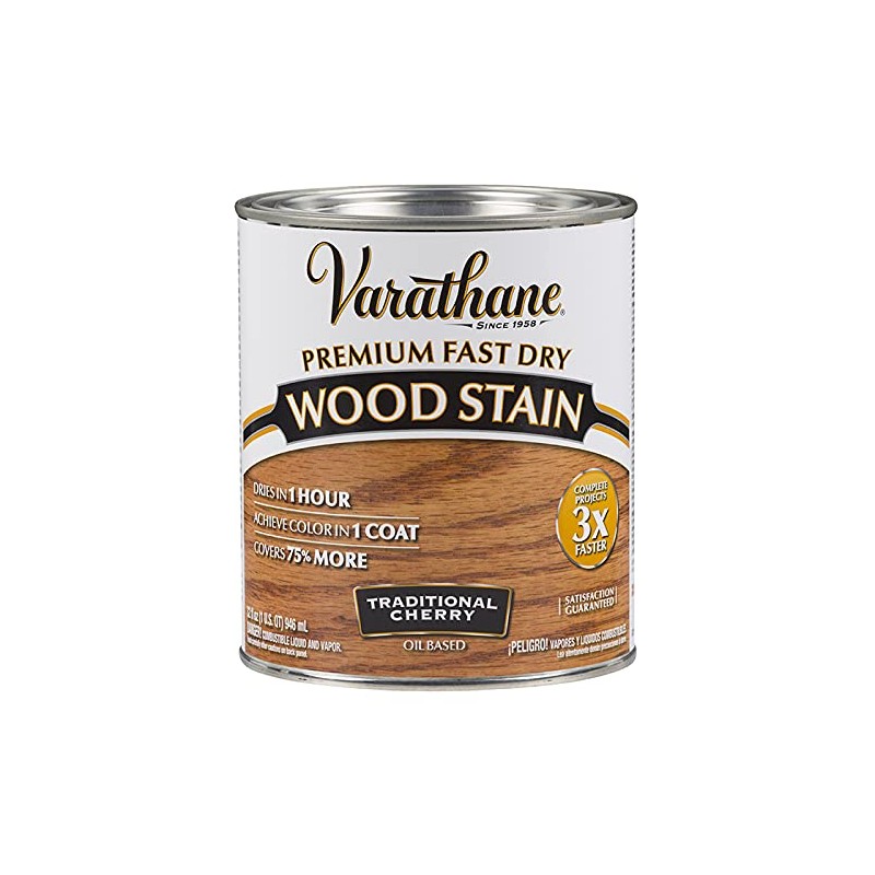 Varathane Fast Dry Wood Stain, Premium, Liquid, Traditional Cherry, 1 qt, Composition: Mineral Spirits, Resin Solution, Stoddard Solvents, Aromatic Petroleum Distillates, 1,2,4‐Trimethylbenzene, Coverage: 225 ‐ 275 sq‐ft/qt, Curing Time: 1 hr to Touch, 1 hr to Recoat and 24 hr to Full Cure at 70 deg F and 50% Relative Humidity, 60 ‐ 90 deg F Application, 65 deg F Flash Point, 532 g/L VOC, 0.93 Specific Gravity, Solvent Odor, Applicable Materials: Wood, Application Method: Brush/Lint Free Rag