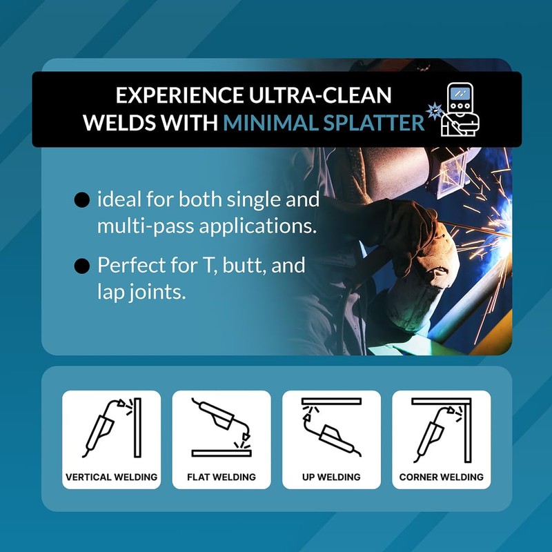 It’s ideal for both single & multi-pass welding and leads to aesthetic T-joints, butt welds, and lap welds. And with a wire thickness of 0.035”, you’ll achieve great penetration without the high risk of burning through the base metal.