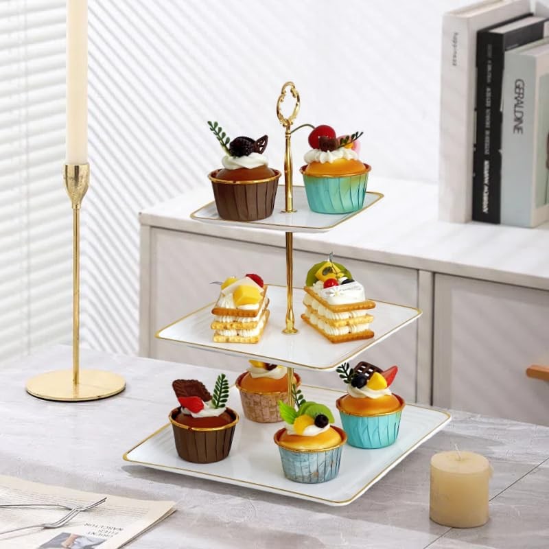 - The tiered dessert tray is cleverly connected with strong gold metal rod, simple and stylish. White plates with gold rim adds a pretty addition to your table