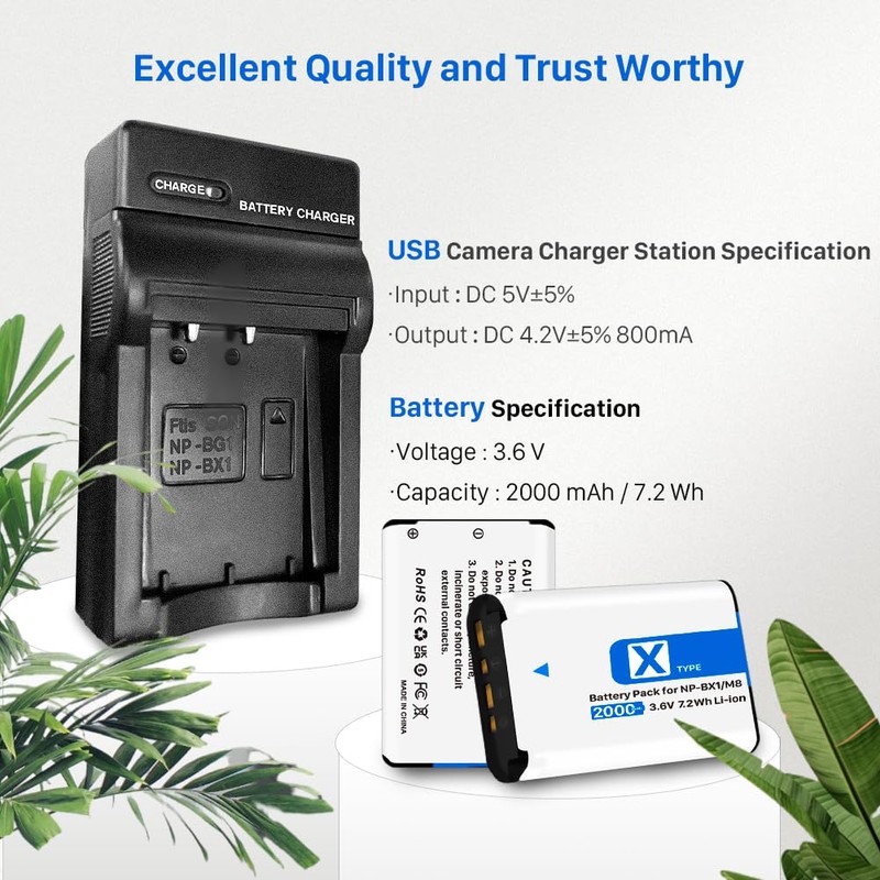 (2 Pack) Rechargeable NP-BX1 Battery and USB Charger Set, 2000mAh High Durability Battery Suitable for Sony ZV-1, ZV-1 II, Cyber-Shot DSC-RX100 (II/III/IV/V/VA/VI/VII), FDR-X3000, AS300 and More