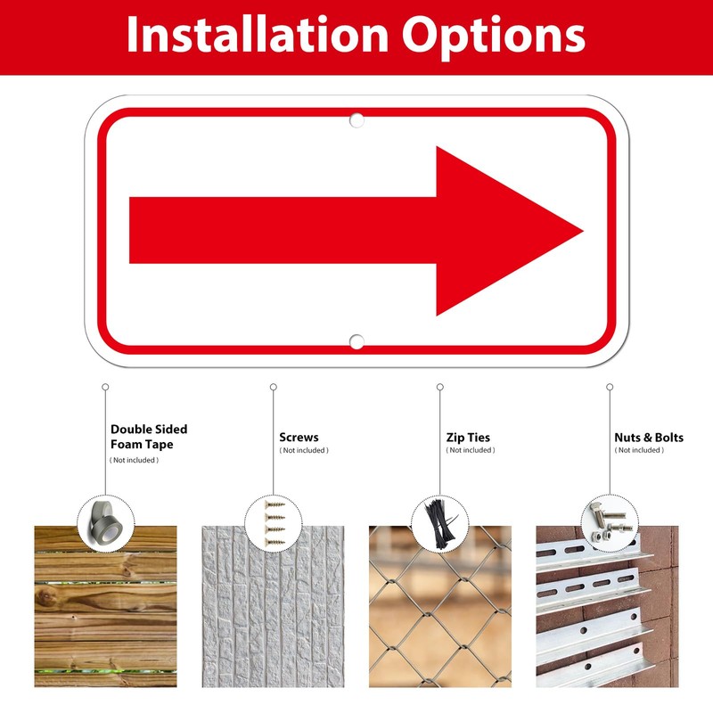 • Easy to Install: Directional Arrow signs have two pre-drilled holes, mount with screws, nails, tie-wraps or wires for easy mounting on every surface including walls, fence, poles and gates.