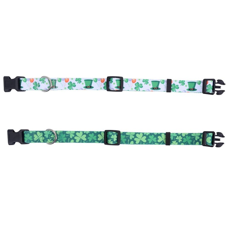 This collar is made of export thickened nylon ribbon,smooth surface,very comfortable and soft. It is very novel,unique and special.The pet collar makes your cat more pretty,lovely and fashionable.The Four Leaf Clover,Green Hat pattern bring a lively Saint Patrick atmosphere in party.Applicable Occasion: Saint Patrick's Day theme Party, Costume Accessories,St. Patrick Decorations etc. **Material:** plastic buckle,durable nylon,Metal D-Rings **Packet includes:** 2 pcs collars,2 different colors **SIZE** Small:Neck 10-13.7", Width 5/8" Medium:Neck12.2-17.7", Width 3/4" Large:Neck 13.8-21.6", Width 1"