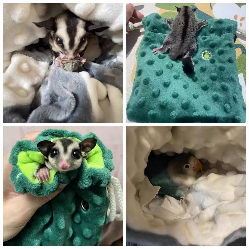 - Premium High Quality - These plush fleece sugar gliders sleeping pouch are made from flannel fabric that retain their softness after countless washings without fading, shrinking, pilling or becoming matted. Neat stitched line and high density seaming makes it optimal for everyday use and will last for years as pets grows.Package Includes: 2 x sugar glider pouch (1*Grey + 1*Green)