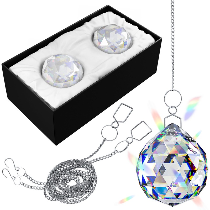 - 2 PACK CRYSTAL PRISMS FOR WINDOWS - Includes two 1.5” diameter hanging crystals. Each prism suncatcher has 120 flawless facets and a hole drilled on top for easy hanging. These crystal balls come with two 10-inch chains and hooks attached, along with an elegant gift box.