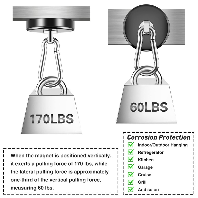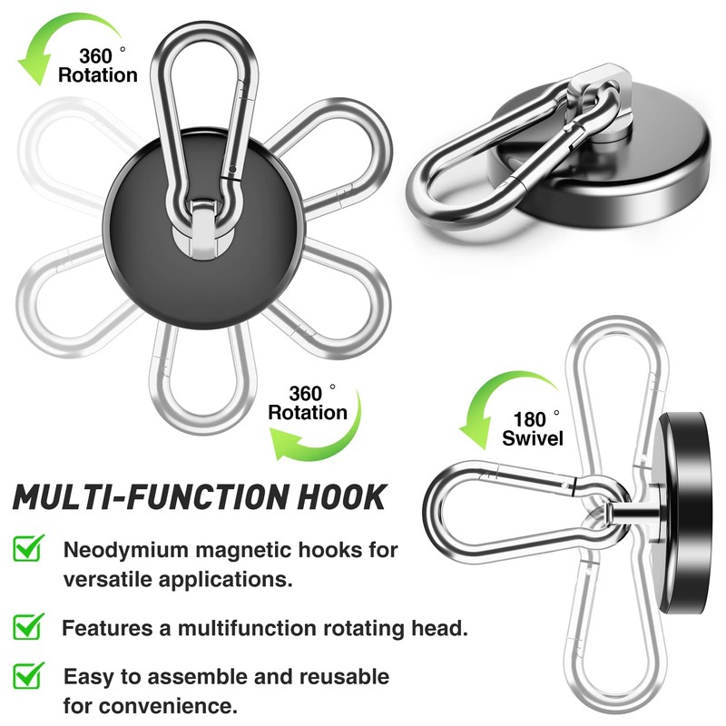 - 🧲【Super Strong Neodymium Magnet Hook】 - This is a really durable and practical strong neodymium magnet hook. Its base diameter is 42mm, which is stronger than the magnetic hooks on the market! Made of neodymium magnets and steel, permanent magnetic and durable. Compact and lightweight with strong force, which can be strongly attracted by Iron Cobalt Nickel and other ferromagnetic material. The shell is black, the spring buckle is silver, and the base is silver.