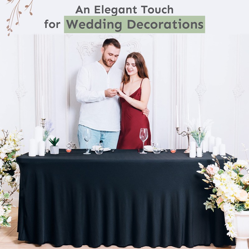 2 Pack Table Skirt for Rectangular Tables 6ft - Wedding Spandex Table Covers for Standard 6 Foot Table - One Piece Fitted Elastic Tablecloth - Great for Party, Events, Trade Shows (Pack of 2, Black)