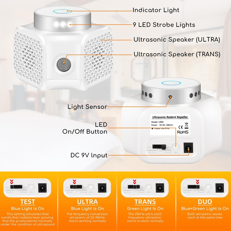 - Four Specialized Modes: Our ultrasonic pest repeller offers four distinct modes to tackle various pests effectively. The Test mode allows you to verify the ultrasound functionality, while the ULTRA, TRANS, and DUO modes provide tailored solutions for different types of pests. This flexibility ensures you have the right tool to combat rodents and other intruders, making it an ideal solution for how to get rid of squirrels in the attic and other spaces