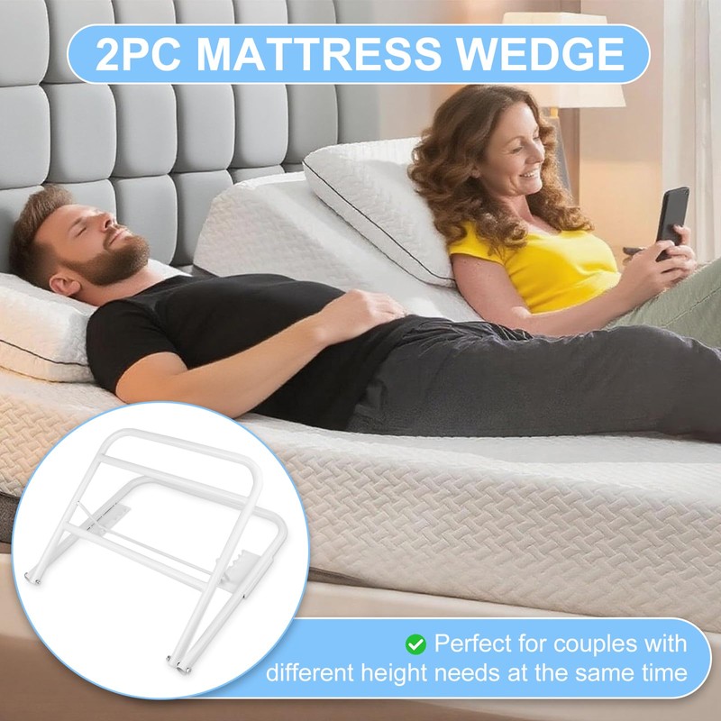- Full-Body Pressure Relief: Two metal under-mattress wedges are designed to fit full-size beds, creating a smooth transition. Eliminating the raised feel of traditional wedges, they support the user's natural cervical curvature while reading or watching in bed, reducing pressure on the eyes, sinuses, and forehead.