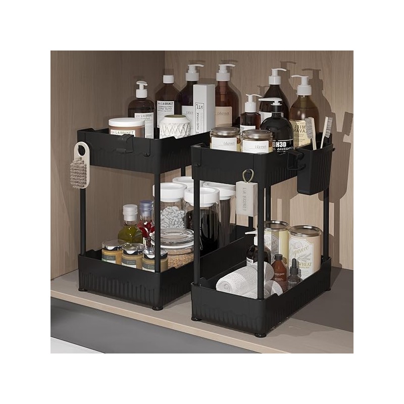 2 Pack Under Sink Organizer, Under Bathroom Cabinet Organizer with Hooks Hanging Cup, Multi-Purpose Storage Shelf for Kitchen Bathroom, Black