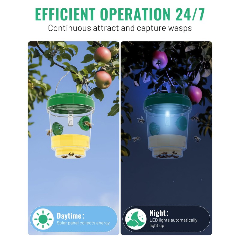 - Solar Powered: Equipped with efficient solar panels, LED insect trap light charge during the day and automatically light up at night to continuously attract and capture wasps.
