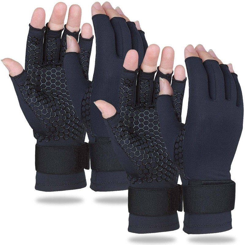 2 Pairs Copper Arthritis Gloves for Women Men, Compression Gloves with Adjust Strap for Arthritis, Wrist Support, Hand Pain, Fingerless Computer Typing Gloves for Carpal Tunnel, RSI (Large/X-Large)
