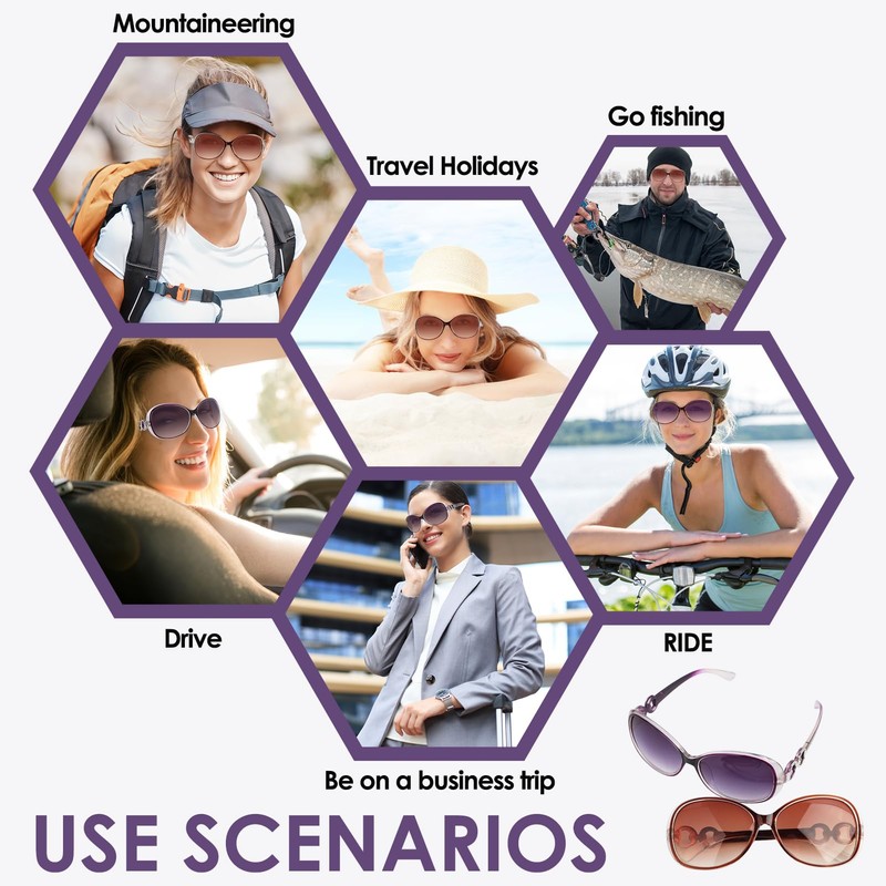 Travel-Friendly Design: Foldable hinges allow the sunglasses to compress into a compact size, fitting easily into pockets, purses, or travel cases. Flexible temple tips and anti-slip grips keep them securely in place during outdoor adventures like hiking, cycling, or skiing.