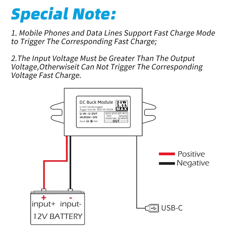- 【Note】1. If your phones or other devices and data cables support fast charging mode, corresponding fast charging can be triggered;2. The input voltage must be greater than the output voltage, otherwise fast charging cannot be triggered.