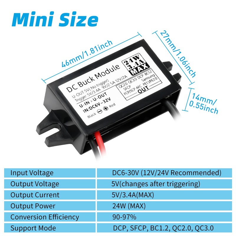 - 【24W】Output voltage:DC 5V; Output current:3.4A Max; Output power:24W Max