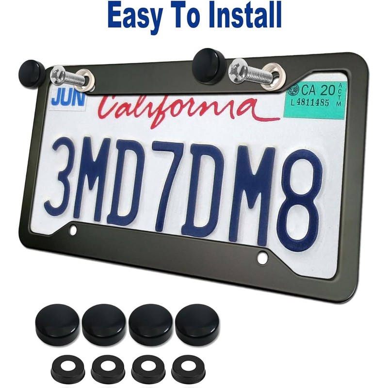 - 🚗This package comes with 2 license plate frames, 8 stainless screw caps, 8 cup washers, 4 tapping screws, 4 pan head screws and 1 x Screwdriver Simply slot a plate into the stainless license plate frame, then align the screw holes on the plate with those on the car license plate frame, and finally screw the license plate on the vehicles. Enjoy your drive with on your side!