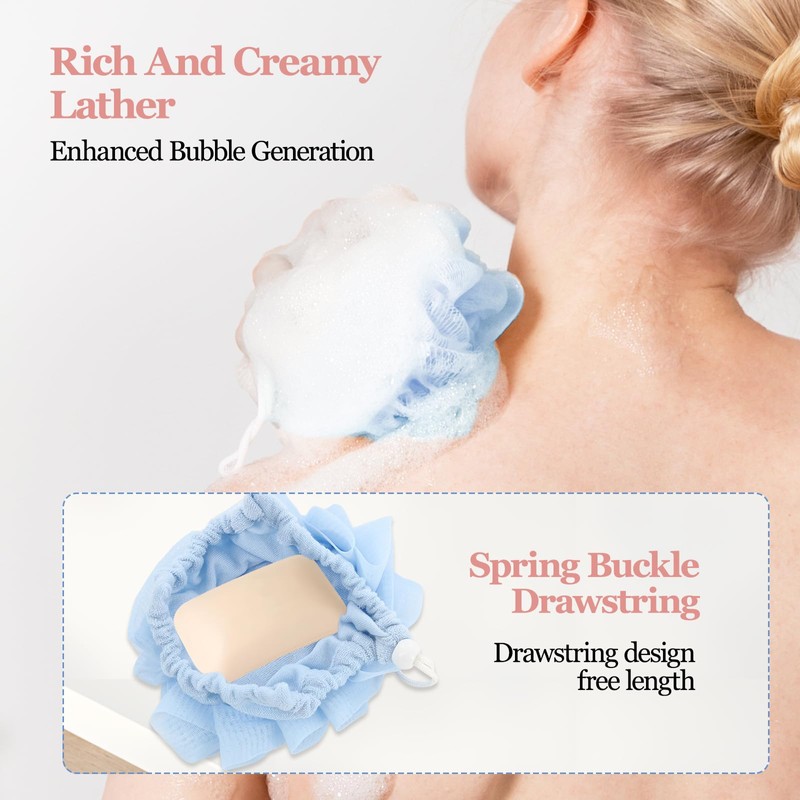 - Drawstring Design: Soap loofah adopts a unique drawstring design, which can firmly fix the soap in the middle and prevent the soap from loosening and slipping during use. The drawstring design makes the operation of loofah wash cloth simple and convenient, and the soap can be easily fixed and replaced even in a slippery environment.