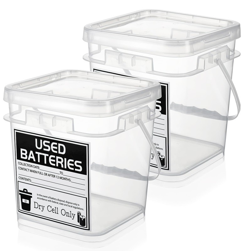 2 Pcs Battery Disposal Container 1 Gallon Dry Cell Storage with Label Battery Recycling Container for Safe Storage and Household & Office Use (Clear, Square)