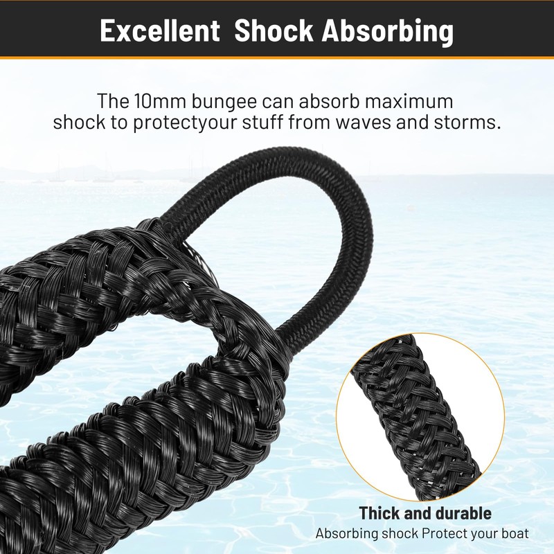 - High quality:This dock line is made of PE braided, lasting and safe. There is a 10mm elastic rope inside, which can act as a built-in buffer, absorb the impact from wind and waves, and protect the boat well.