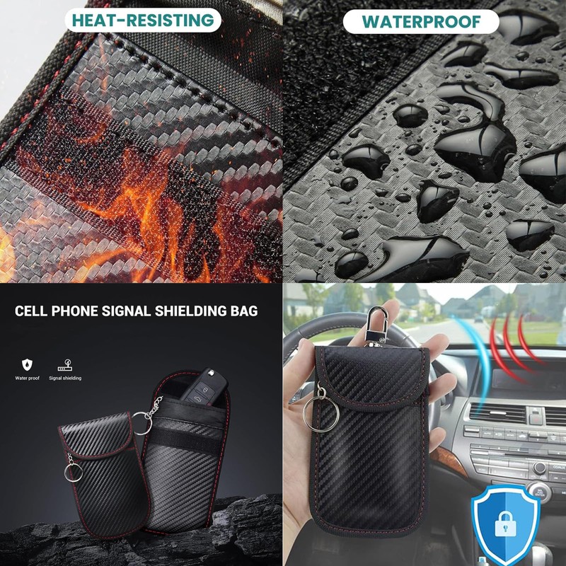 - 【RFID Protection Function】 Faraday bag is constructed with premium carbon fiber textured material and two layers of shielding materials, which can block phone calls, SMS, WI-FI, Bluetooth, 5G, NFC signals, etc. It’s suitable for all key fob sizes. Simply place the car key into the bag, and you will find no response from your car. Ideal for protecting your car and credit cards, this is a must-have in any car electronics collection.