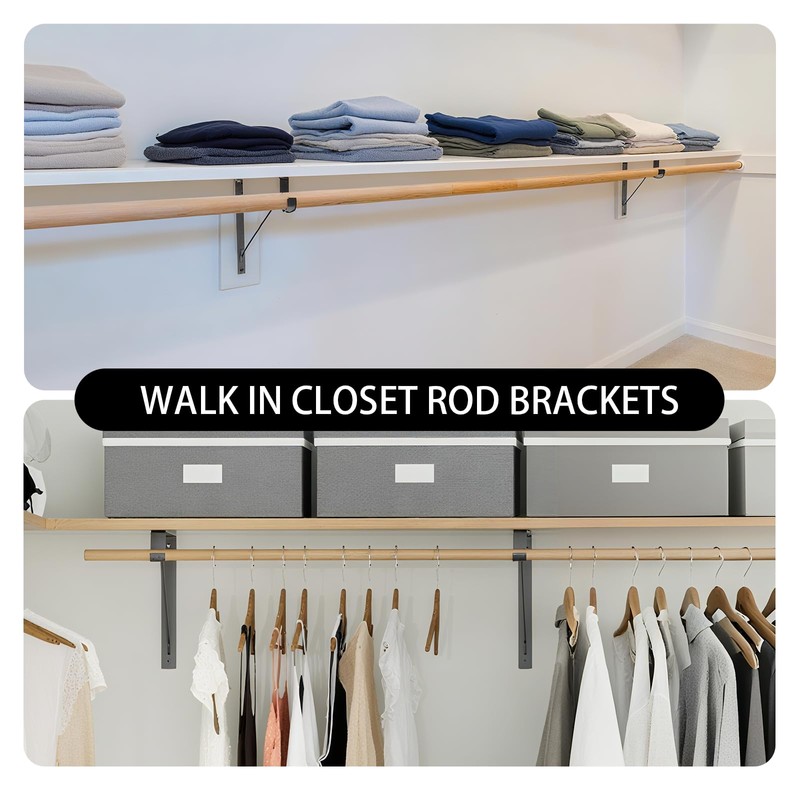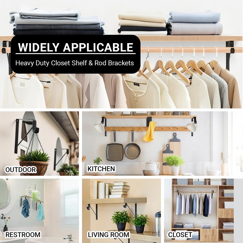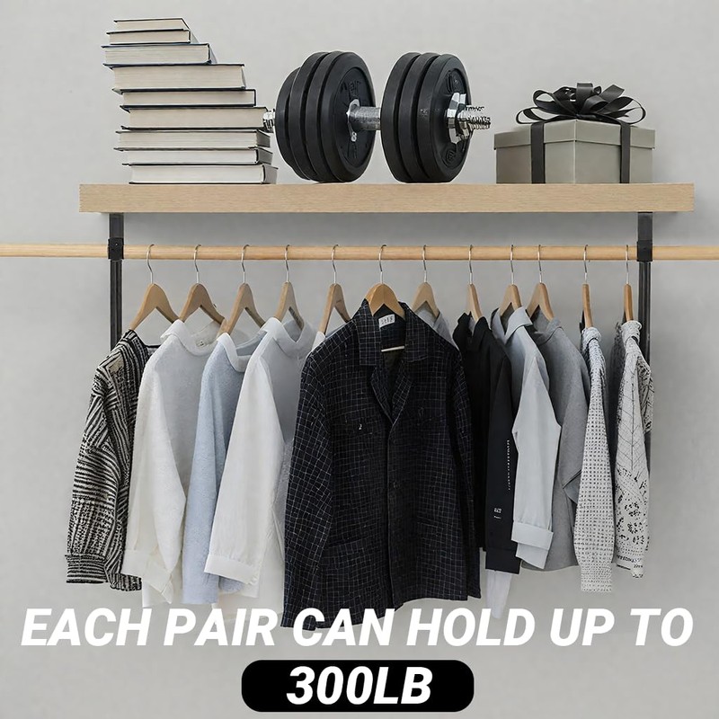 - Engineered with reinforced triangular structure to maximize weight distribution, these brackets securely hold up to 300 lbs. Ideal for dual-purpose use with shelves and hanging rods in any room