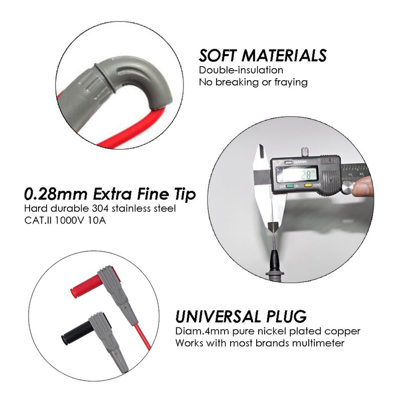 - Φ0.28MM TEST PROBE_ Durable stainless steel ensures good conductivity and accurate measurement. Equipped with detachable caps to prevent dust and effectively reduce the damage to probe. With 0.28mm extra fine tip allows you to work on narrow operating area and perform even more precise testing for hardware like circuit boards.