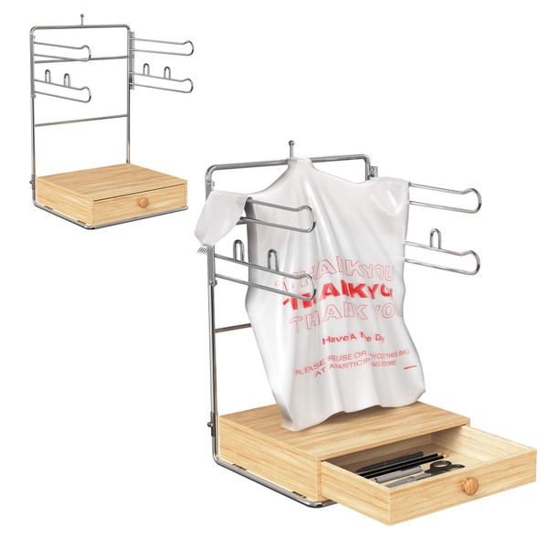 - Convenient Storage:The plastic bag holder features a simple design and is easy to install. With a chrome-plated metal frame and a wooden drawer base, it provides storage for everyday items like scissors, pens, and receipts, combining practicality with aesthetic appeal