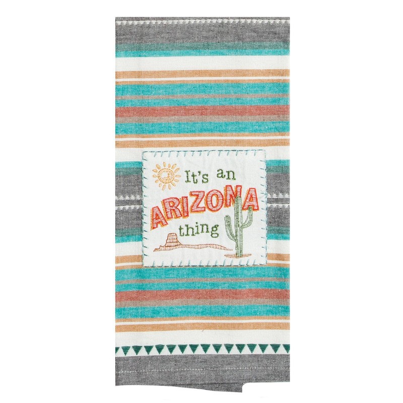 - A vibrant Arizona-themed flour sack towel with embroidered state outline featuring the sentiment 'It's an Arizona thing'. Some of the highlights within the design are Phoenix, Grand Canyon, and Four Corners.