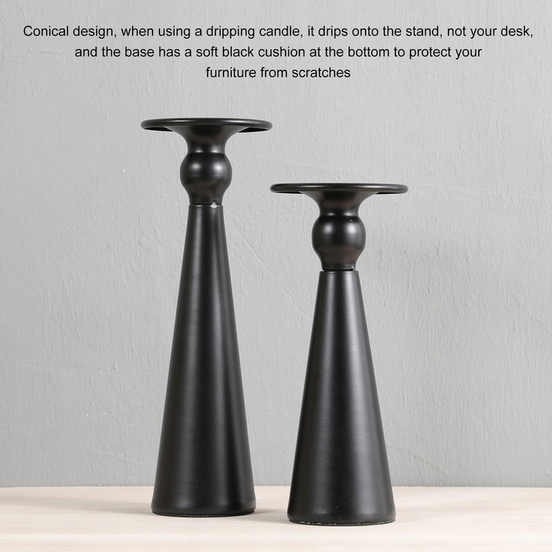 1、Matte Black: The candle holder stand is matte black with a glossy metal design for a retro yet modern feel, glossy, slim and modern. 2、Hourglass Shape: An elongated hourglass shape with good weight, unique design, understated and elegant. 3、Tapered Design: Due to the tapered design on the candle holder, when using a dripping candle, it will drip onto the stand, not your table, and the base has a soft black cushion at the bottom to protect your furniture from scratched. 4、Simple Cleaning: Simple matte finish, clean and dry with a soft cloth, do not use harsh chemicals or abrasives. 5、Applicable Scenarios: Candlesticks are suitable for birthdays, candlelight dinners, decorations for dining rooms, living rooms, living rooms, study rooms and bars, celebrations, anniversaries, housewarming gifts.