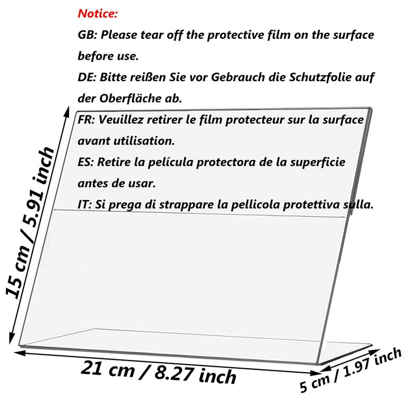 • ❤ Package Includes ❤ The acrylic poster have 2 pieces in total, clear, the size is 21.1 x 14.9 x 5 cm / 8.3 x 5.86 x 1.96 inch, the A5 slant sign holders are perfectly designed to display information to your target audience.