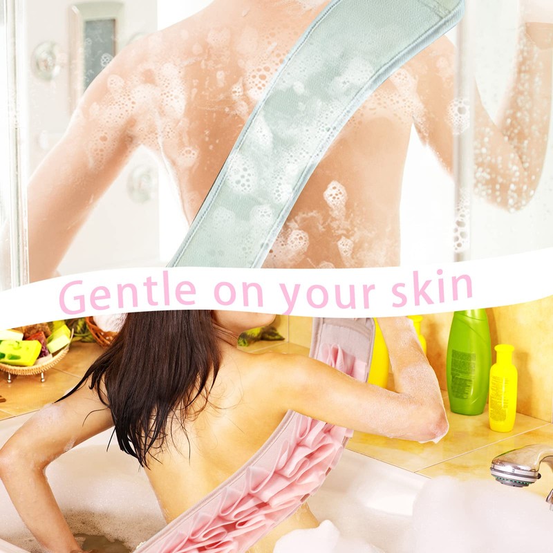 - Shower back scrubber - This body scrubber is long enough to wash most parts of your body, also suitable for the elderly and children; the back cleaner for shower has shoulder straps at both ends, you can easily hang it on the wall, easy to dry; The double-sided design of the exfoliating back scrubber is available, one side is made of fine mesh material, which can gently clean the dirt on the skin, and the other side is made of fabric that is deep. Exfoliates the skin without hurting the skin.