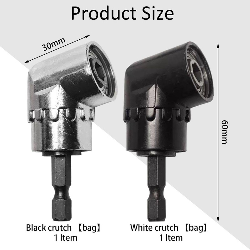 - Product contents: you will receive 2 pieces of right-angle drills, size 60 x 30 mm, each in the colours silver and black. Each drill comes with a corresponding extension and holder, which are suitable for a variety of drilling tools and screwdrivers.