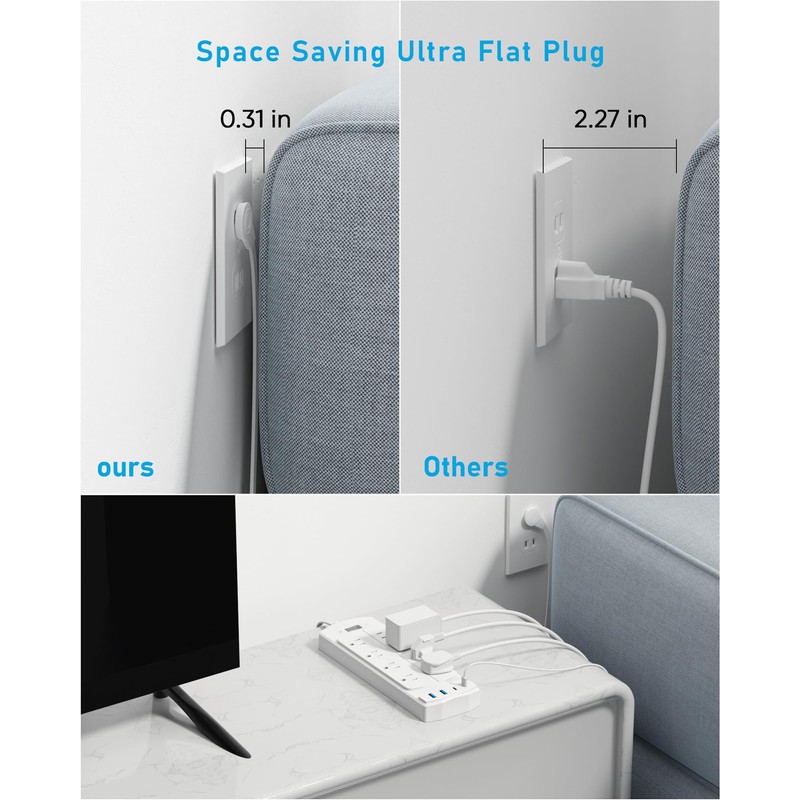 - 【2 Prong Flat Plug Power Strip】with only 0.27in ultra thin flat plug design, flat wall plug is much thinner than traditional plugs, which can hide in the back of wardrobe, bed or refrigerator, no waste for every inch space for your home.