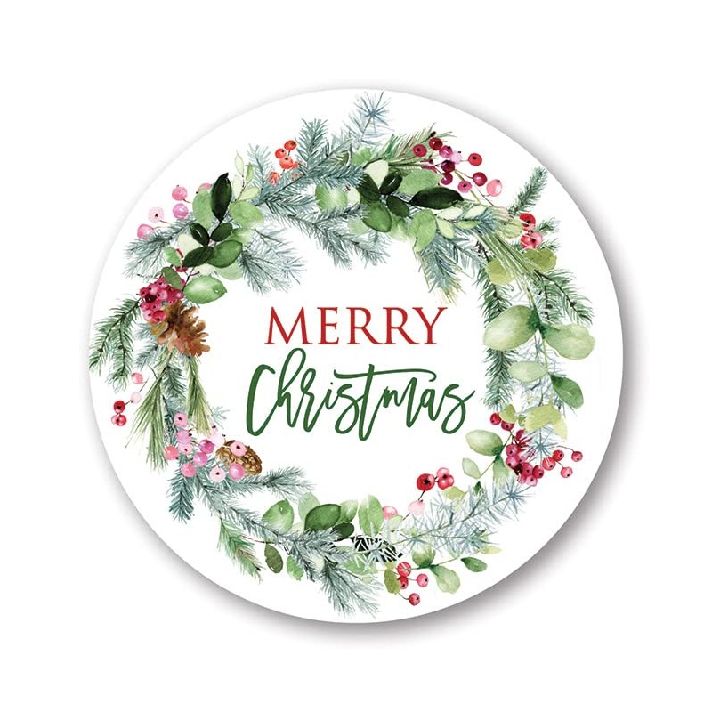 2" Round Greenery Wreath Merry Christmas Stickers (40 Labels)