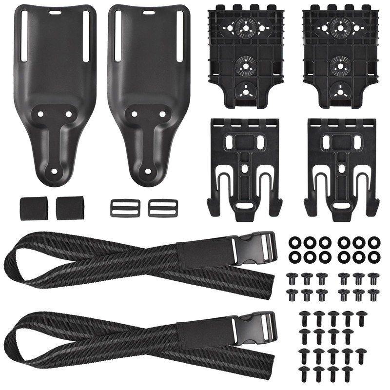 - Included in the kit: Two quick locking system (QLS 19 22), two 2-inch mid-ride belt loops, two adjustable elastic leg straps, two tactical leg strap modulars, six long screws, six medium-length screws, and six short screws