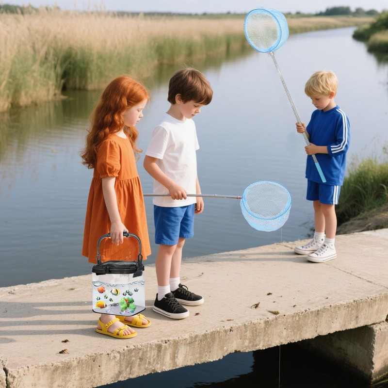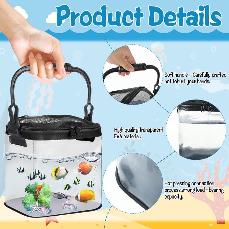 Set includes 2 sets of catch and release plastic beach aquarium kit, ymade of soft plastic, transparent material, top of the nylon mesh cover, with a comfortable handle, very suitable for outdoor activities in summer.