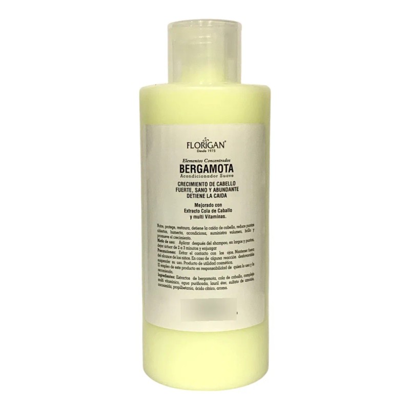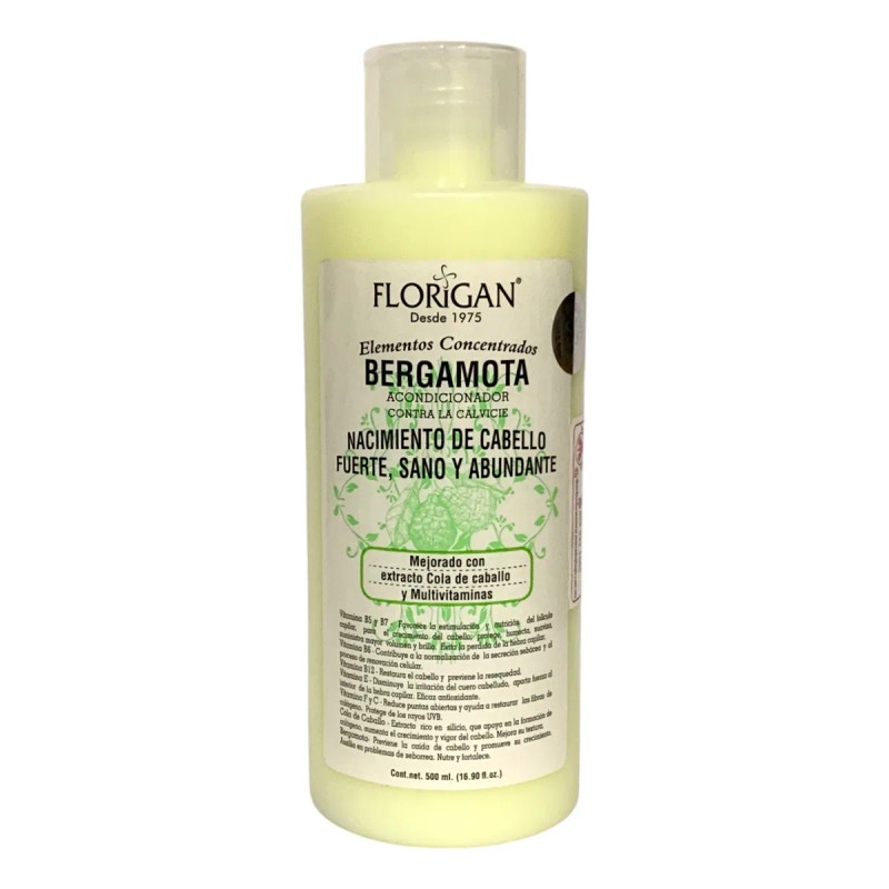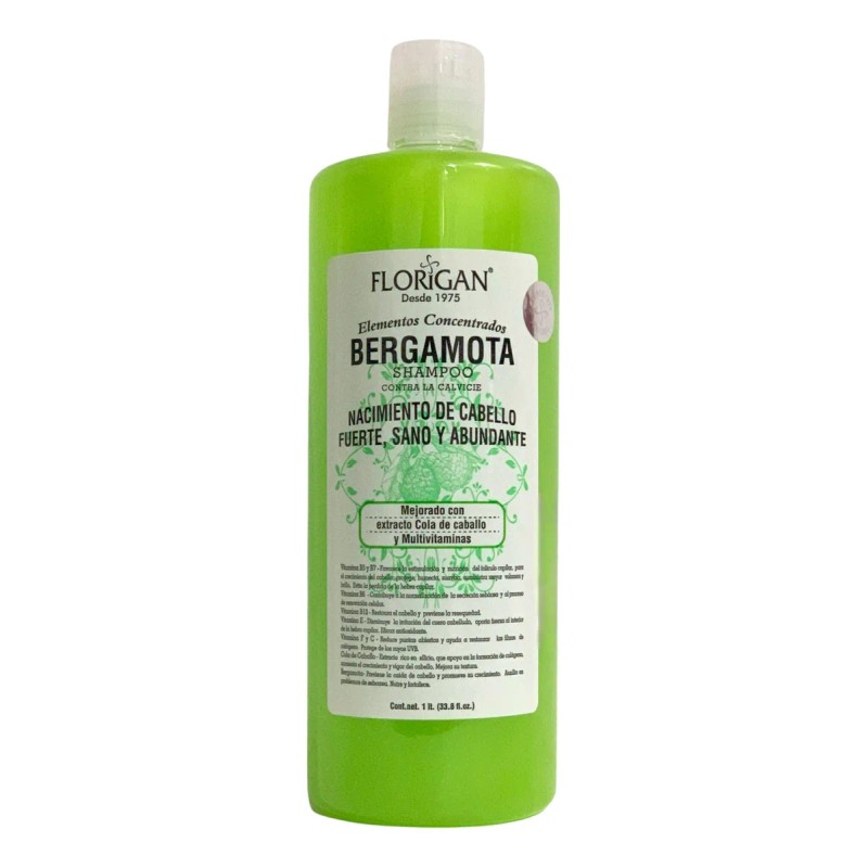 Shampoo Contra la Calvicie Elementos Concentrados Bergamota Florigan 1lt. Vitaminas B5 y B7- Favorece la estimulación y nutrición del folículo capilar para el crecimiento del cabello; protege, humecta y suaviza. Suministra mayor volumen y brillo. Evita la pérdida de la hebra capilar. Vitamina B6- Contribuye a la normalización de la secreción sebácea y al proceso de renovación celular. Vitamina B12- Restaura el cabello y previene la resequedad. Vitamina E- Disminuye la irritación del cuero cabelludo, aporta fuerza al interior de la hebra capilar. Eficaz antioxidante. Vitaminas F y C- Reduce puntas abiertas y ayuda a restaurar las fibras de colágeno. Protege de los rayos UVB. Cola de Caballo- Extracto rico en silicio que apoya en la formación de colágeno, aumenta el crecimiento y vigor del cabello. Mejora su textura. Bergamota- Previene la caída de cabello y promueve su crecimiento. Auxilia en problemas de seborrea. Nutre y fortalece. Nacimiento del cabello, fuerte, sano y abundante. Mejorado con extracto de Cola de Caballo y Multivitaminas.